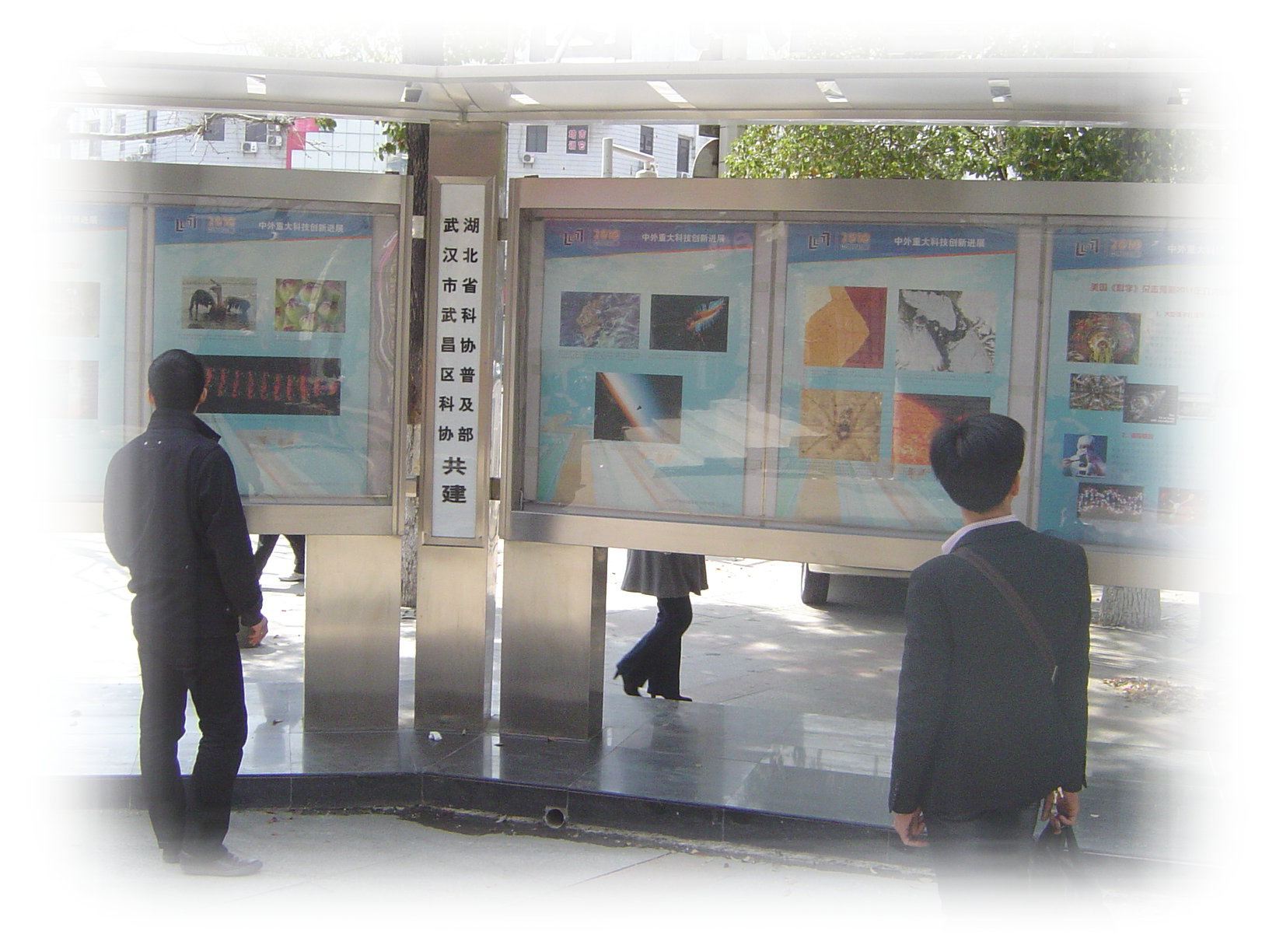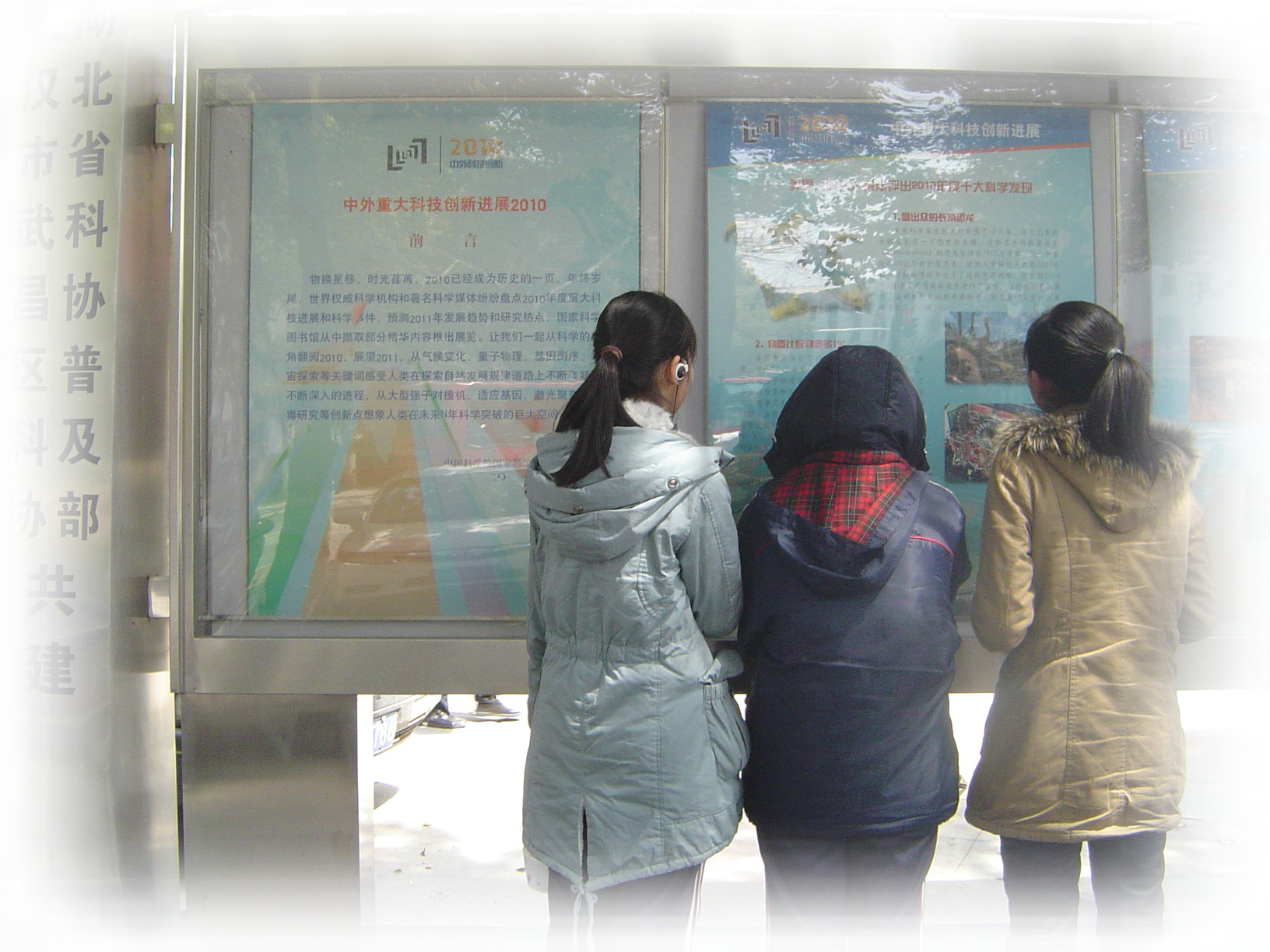 3月18日至4月18日期间,武汉分馆与武汉市水果湖街道联合举办主题为《2010中外重大科技创新进展》的为期一个月的科普图片展活动。